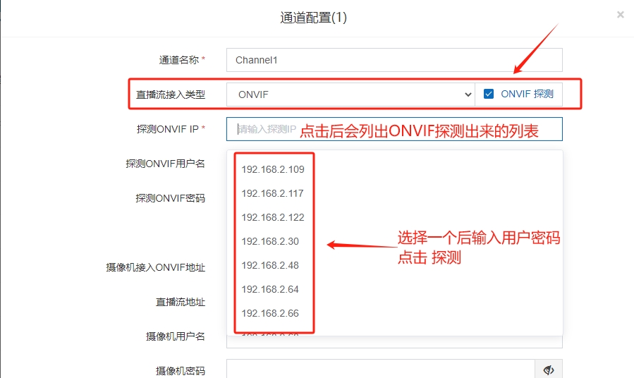 弹出配置页,并输入接入摄像机的IP地址、端口、RTSP地址、用户名、密码、按需直播等选项,支持Onvif控制的可以填入Onvif地址,配置完成后点击确定。